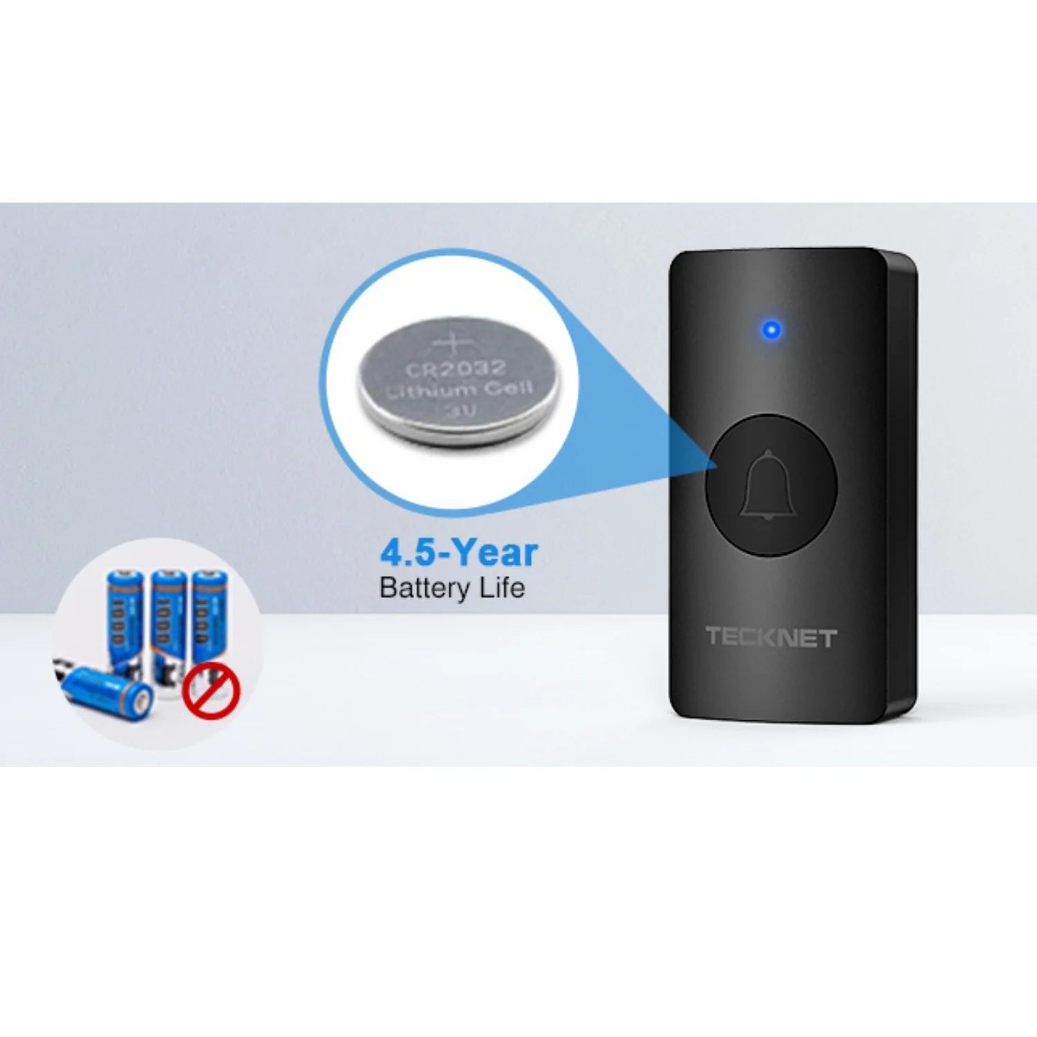 Cette sonnette étanche est dotée d'un anneau d'étanchéité IP44 et résiste aux intempéries (de -20 °C à 60 °C). L'émetteur fonctionne avec une pile CR2032 3 V respectueuse de l'environnement, d'une durée de vie allant jusqu'à 4,5 ans.