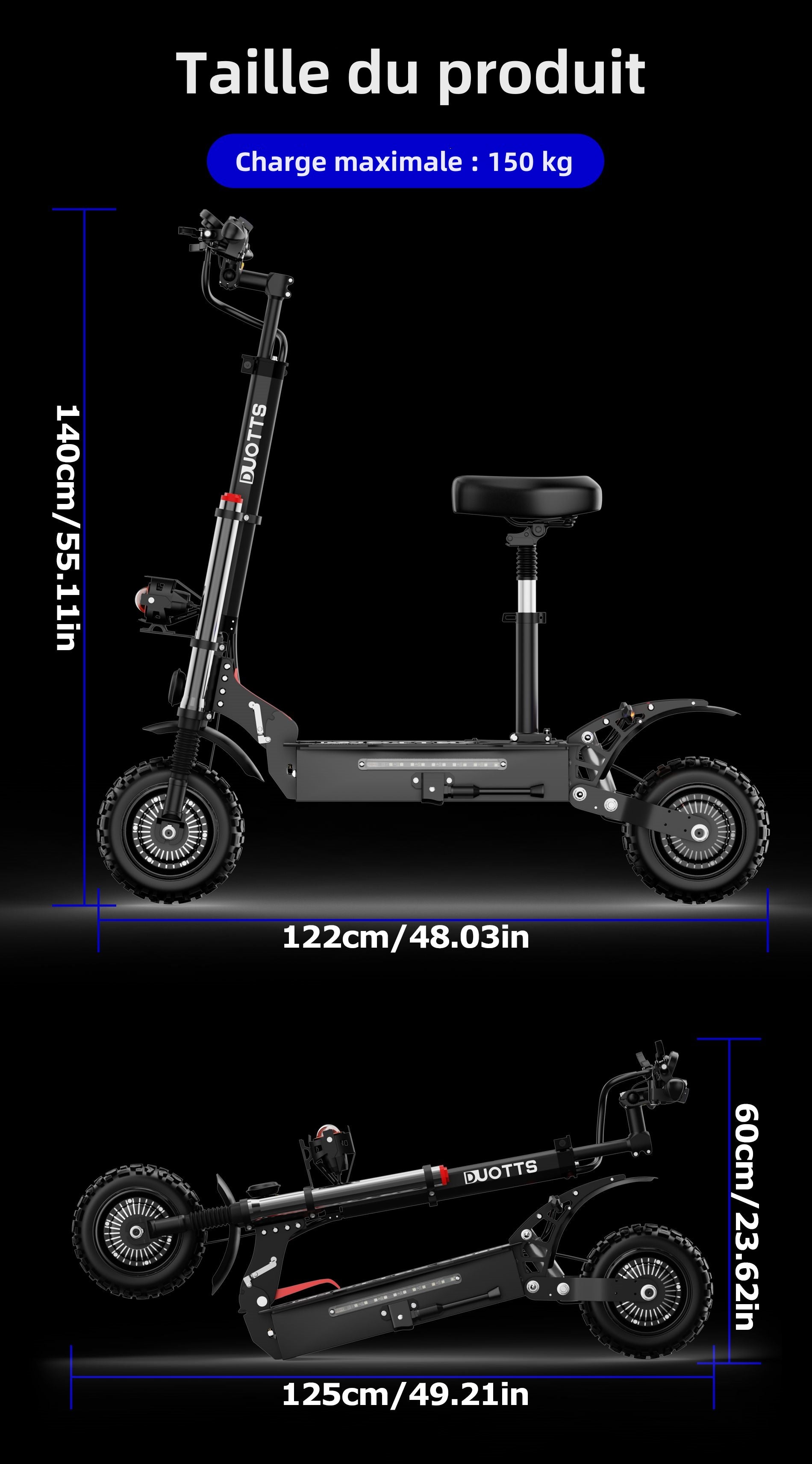 Les amortisseurs à ressort avant et arrière du D66 assurent une conduite souple et confortable. Les pneus tout-terrain de 11 pouces offrent une traction et une stabilité excellentes, tandis que la hauteur réglable (120-140 cm) et la hauteur de la selle (72-82 cm) conviennent aux conducteurs de différentes tailles.
