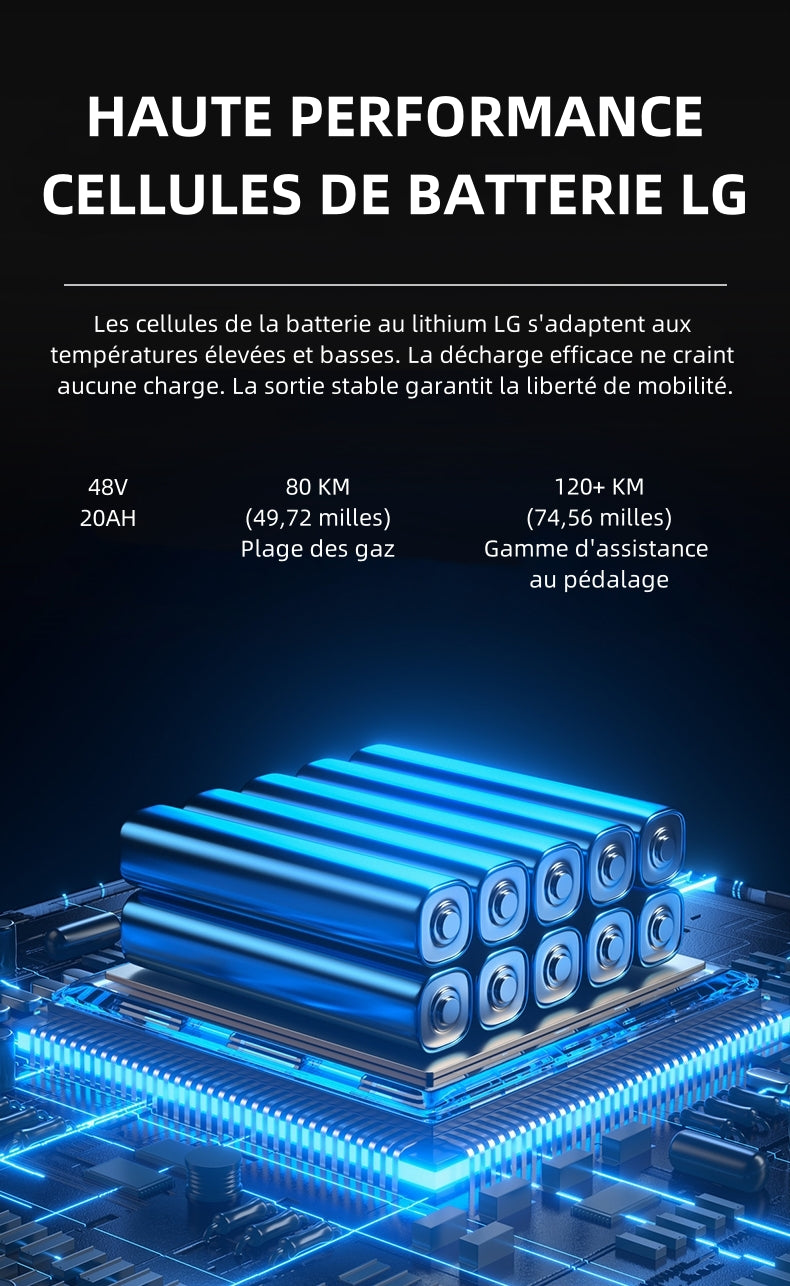 Le King750 utilise une batterie LG 48V 20AH, qui fournit une puissance électrique fiable et durable ! Le noyau électrique de 5000 mAh avec système de gestion de la batterie (BMS) contribue à l'autonomie et à la durabilité.