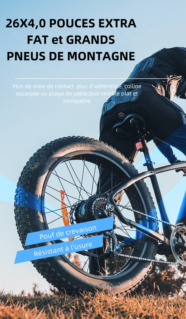 Le gros pneu de 4'' de large apporte une friction au sol très forte et une méthode de freinage sûre. La capacité du King750 à s'adapter aux terrains difficiles est grandement améliorée.