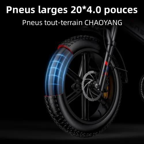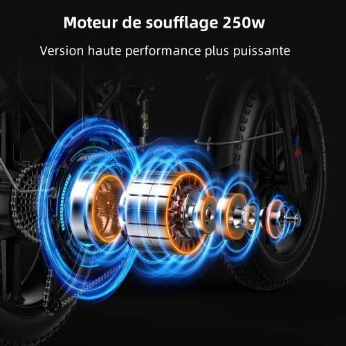 250W 48V 13Ah : Sa batterie et son incroyable moteur sont différents des autres, en plus de ses grosses roues faites pour tous les terrains. Autonomie jusqu'à 50 milles en mode pédalage assisté. 1 à 4 heures de charge.