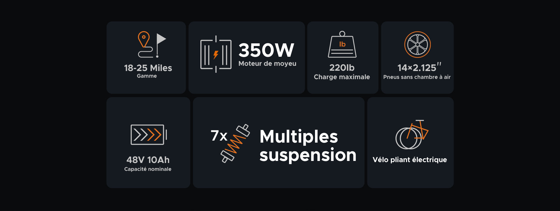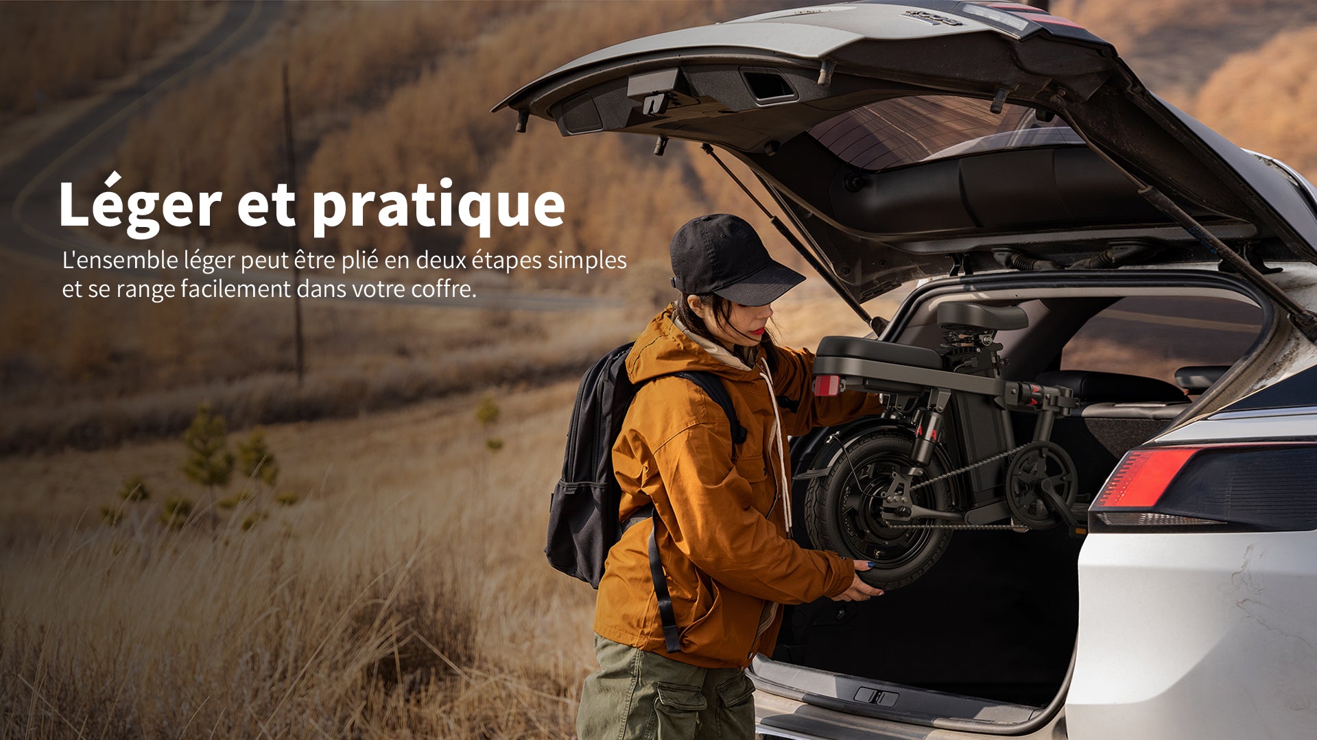 Énergie cinétique : ce vélo électrique pliant est équipé d'un moteur sans balais haute puissance 48 V 250 W, qui peut se déplacer facilement sur une pente de 10 degrés. Il existe trois modes de conduite : pédale, assistance électrique et électrique pur pour répondre à des besoins de déplacement plus personnels et aux conditions routières.