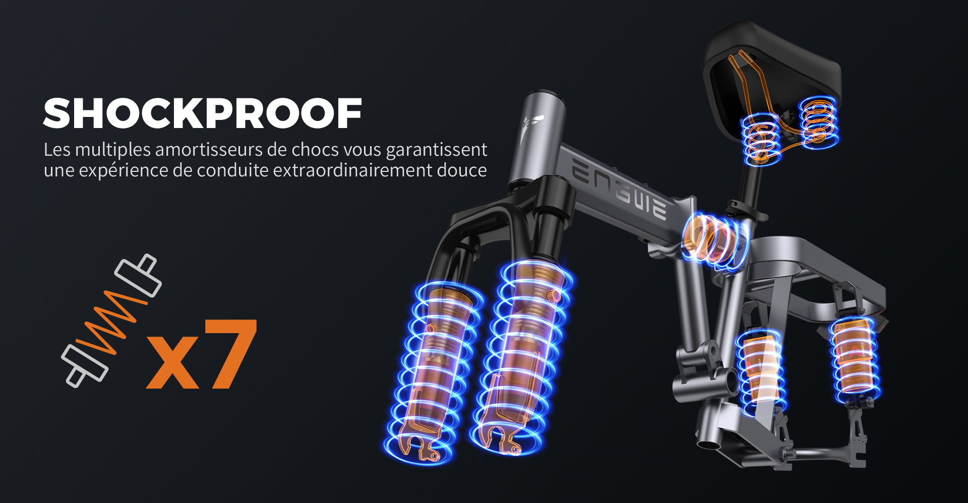Amortisseurs quadruples : le nouveau design, vélos électriques pour adultes avec absorption des chocs multiples, structure de force triangulaire professionnelle, amortisseur de fourche avant, amortisseur central, double amortisseur de roue arrière, amortisseur de selle, même si la route est cahoteuse, c'est comme rouler sur terrain plat.